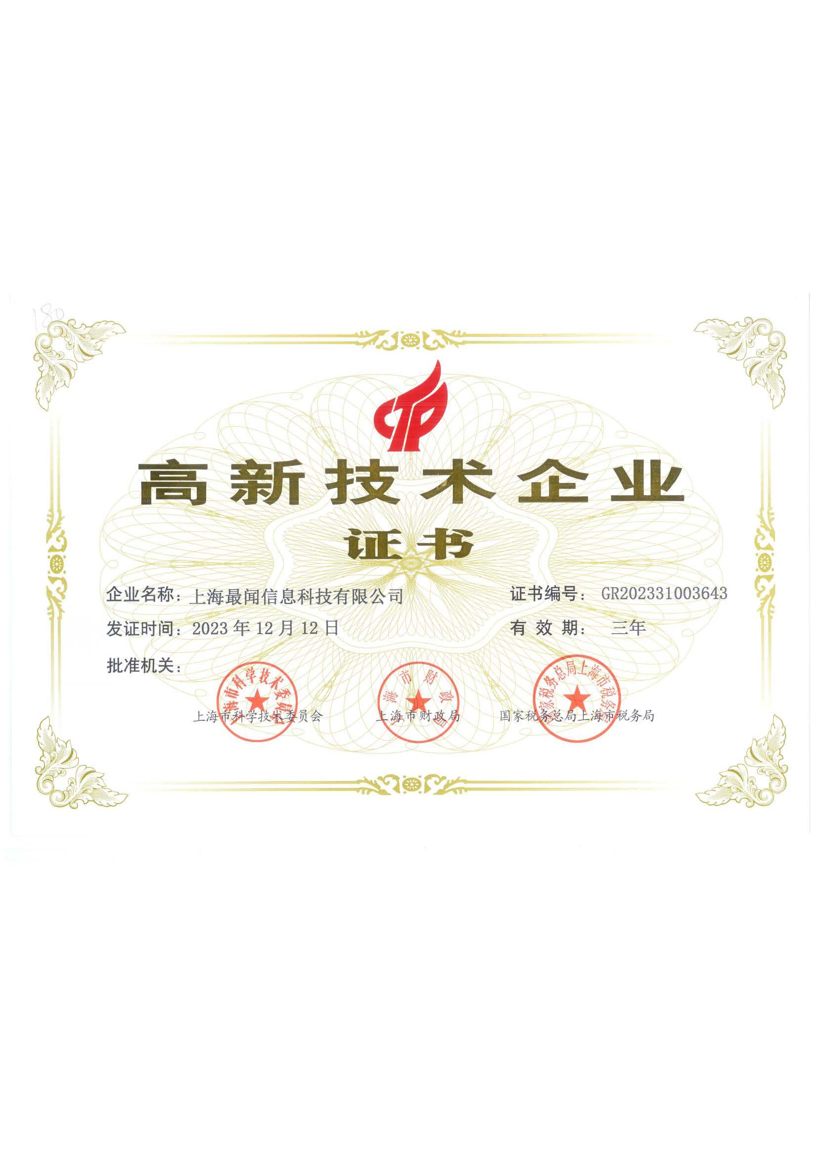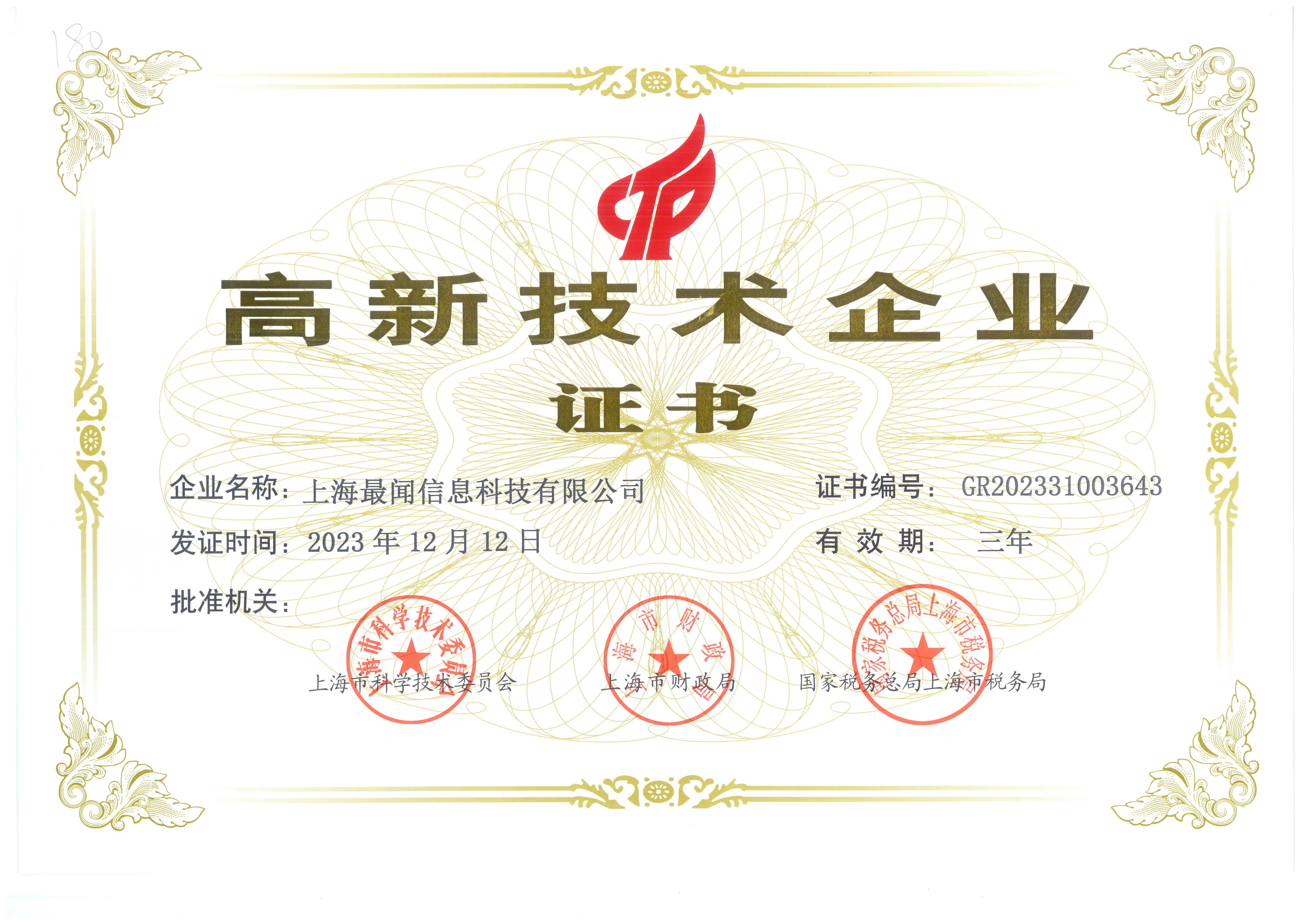 高新技术企业证书